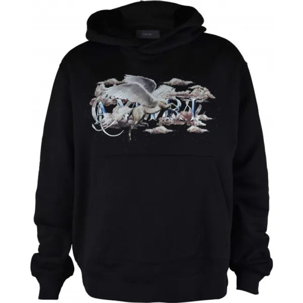 Amiri sweatshirt met capuchon van zwart katoen.Grafische eenhoorn- en wolkenprint op de voorkant.Blauw logo gedrukt op het ontwerp.Kangoeroezak.Geribde randen.Gemaakt in Italië.