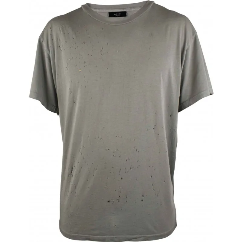 Lichtgrijs T-shirt Amiri.Verouderd effect met kleine gaatjes.Ronde hals, mouwen, losse pasvorm.100% katoen.
