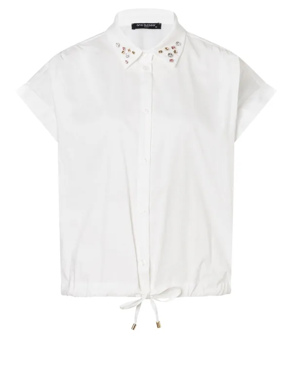 Blouse type: Wijde blouse; Design: Gesneden mouw, Taille met trekkoord; Materiaal: Katoen; Motief: Effen; Kraag: Kentkraag; Details: Sierstenen; Pasvorm: Wijde pasvorm; Armlengte: Kwartmouw; Lengte: Normale lengte