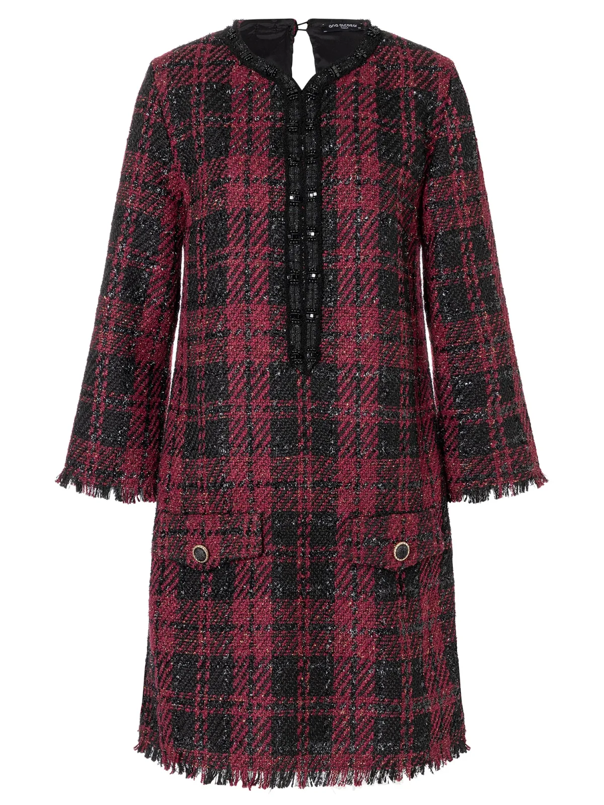 Design: Figuurnaden, Gefranjerde zoom, Recht model, Keyholesluiting, Knop placket, Opzet-/flapzak; Type sluiting: Knoopsluiting; Materiaal: Bouclé; Halstype: V-hals; Motief: Geruit; Details: Franjes, Sierstenen; Extra's: Glitterend, Op staal naden; Lengte: Knielengte; Snit: Recht; Pasvorm: Normale pasvorm; Armlengte: Driekwart mouw
