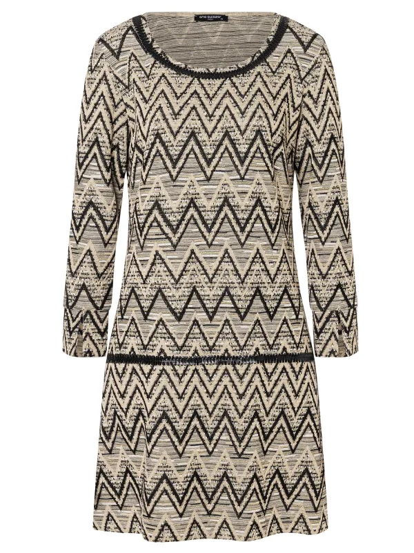 Design: A-lijn, Figuurnaden, Rechte manchetten, Zijdelingse inkepingen; Halstype: Ronde hals; Motief: Visgraat; Soort bandjes: Normale bandjes; Lengte: Knielengte; Snit: Uitlopend; Pasvorm: Losse pasvorm; Armlengte: Driekwart mouw