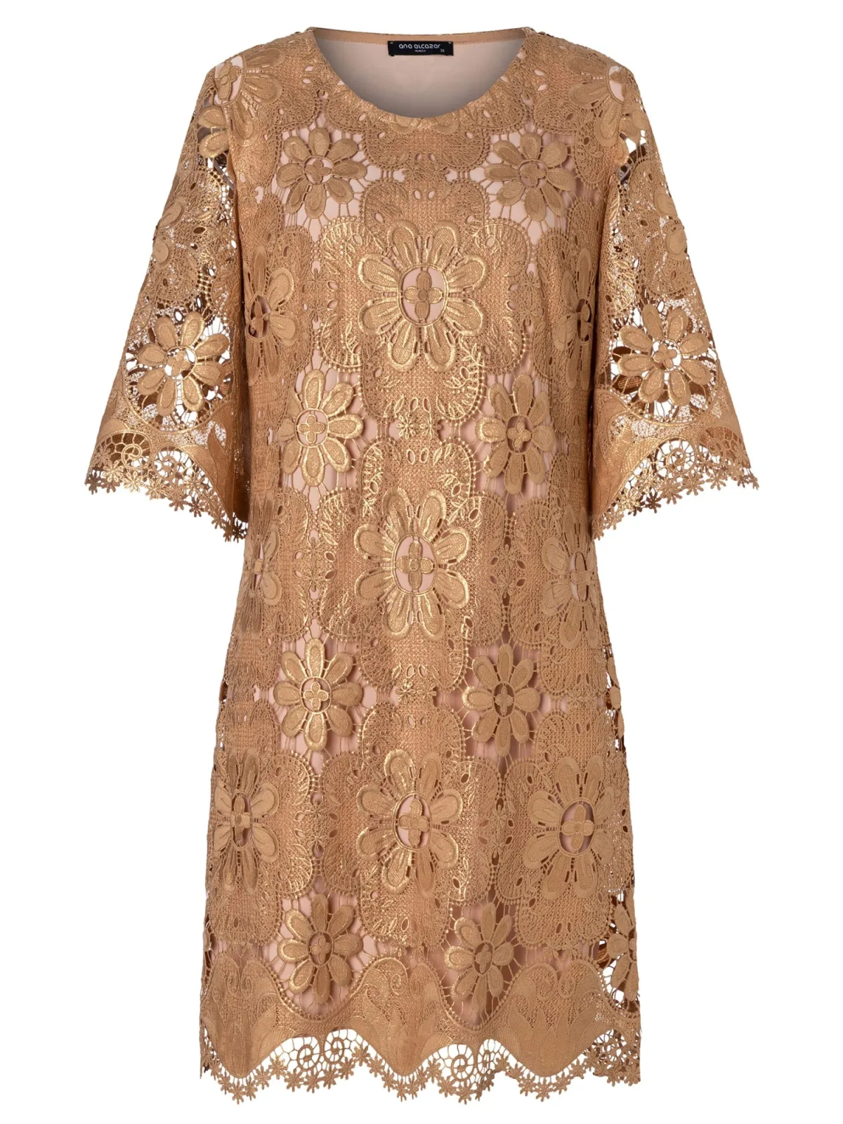 Design: Figuurnaden; Halstype: Ronde hals; Motief: Bloemenprint; Extra's: All-over patroon, Applicaties; Lengte: Knielengte; Snit: Recht; Pasvorm: Losse pasvorm; Armlengte: Halve mouw