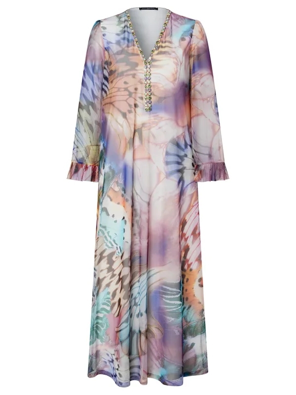 Design: Trompetmouwen; Halstype: V-hals; Details: Ruches; Extra's: All-over patroon; Lengte: Lang/maxi; Pasvorm: Losse pasvorm; Armlengte: Lange mouw