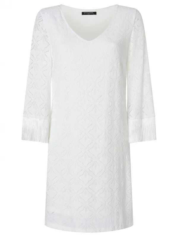 Design: Rechte zoom; Halstype: V-hals; Motief: Effen; Details: Franjes, Kant; Extra's: Met textuur; Lengte: Kort/mini; Snit: Recht; Pasvorm: Losse pasvorm; Armlengte: Lange mouw
