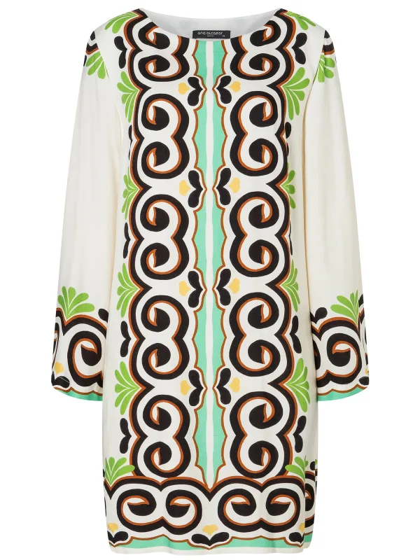 Design: Figuurnaden; Type sluiting: Knoopsluiting; Materiaal: Viscose; Halstype: Ronde hals; Extra's: All-over patroon; Lengte: Knielengte; Snit: Recht; Pasvorm: Losse pasvorm; Armlengte: Lange mouw