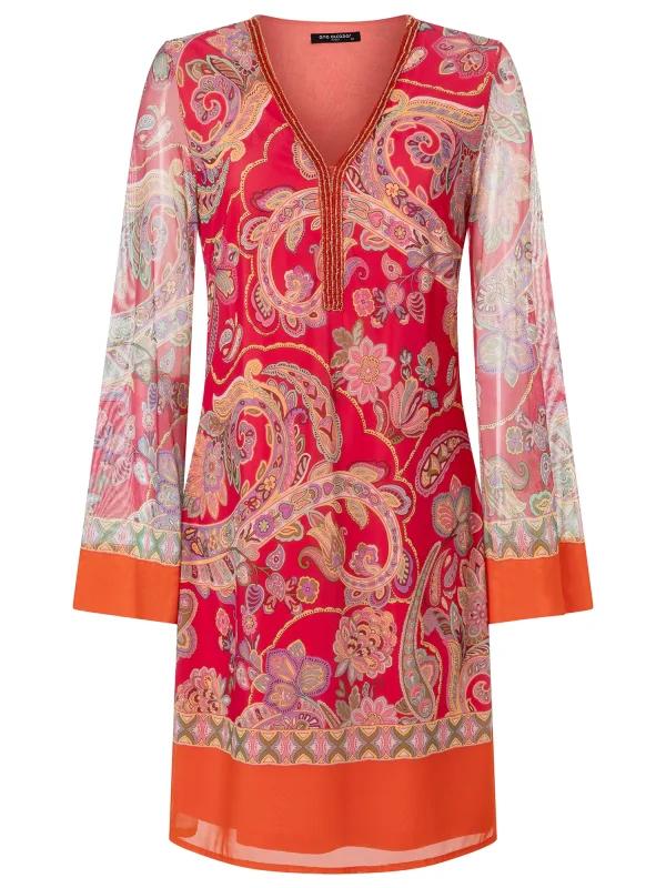 Design: Gevoerde zoom/rand; Halstype: V-hals; Details: Parels; Extra's: All-over patroon; Lengte: Knielengte; Snit: Recht; Pasvorm: Losse pasvorm; Armlengte: Lange mouw