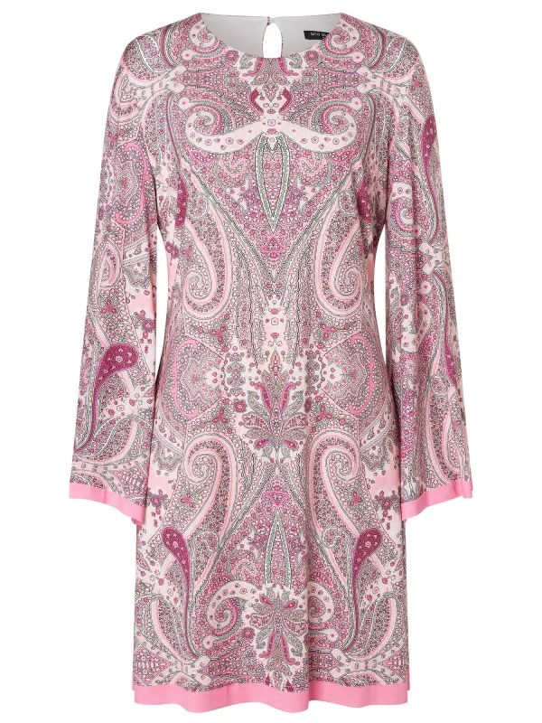 Design: Keyholesluiting, Trompetmouwen; Type sluiting: Knoopsluiting; Materiaal: Jersey; Halstype: Ronde hals; Motief: Paisley; Details: Cut-outs; Extra's: Gladde stof; Lengte: Knielengte; Snit: Recht; Pasvorm: Losse pasvorm; Armlengte: Lange mouw