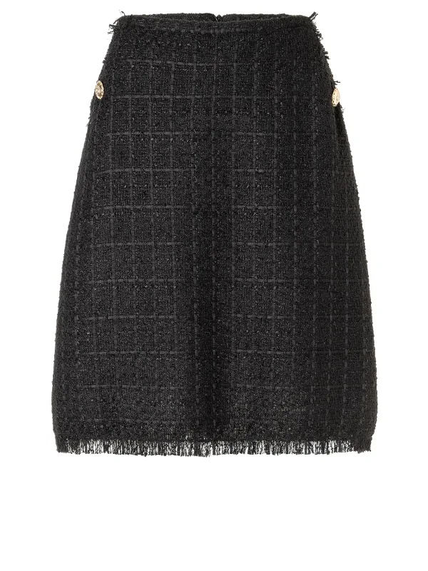 Design: Ritssluiting, A-lijn, Gefranjerde zoom, Zakken aan de zijkant; Type sluiting: Ritssluiting; Materiaal: Bouclé; Motief: Geruit; Rokvorm: A-lijn rok; Details: Franjes; Extra's: Op staal naden; Lengte: Knielengte; Pasvorm: Normale pasvorm