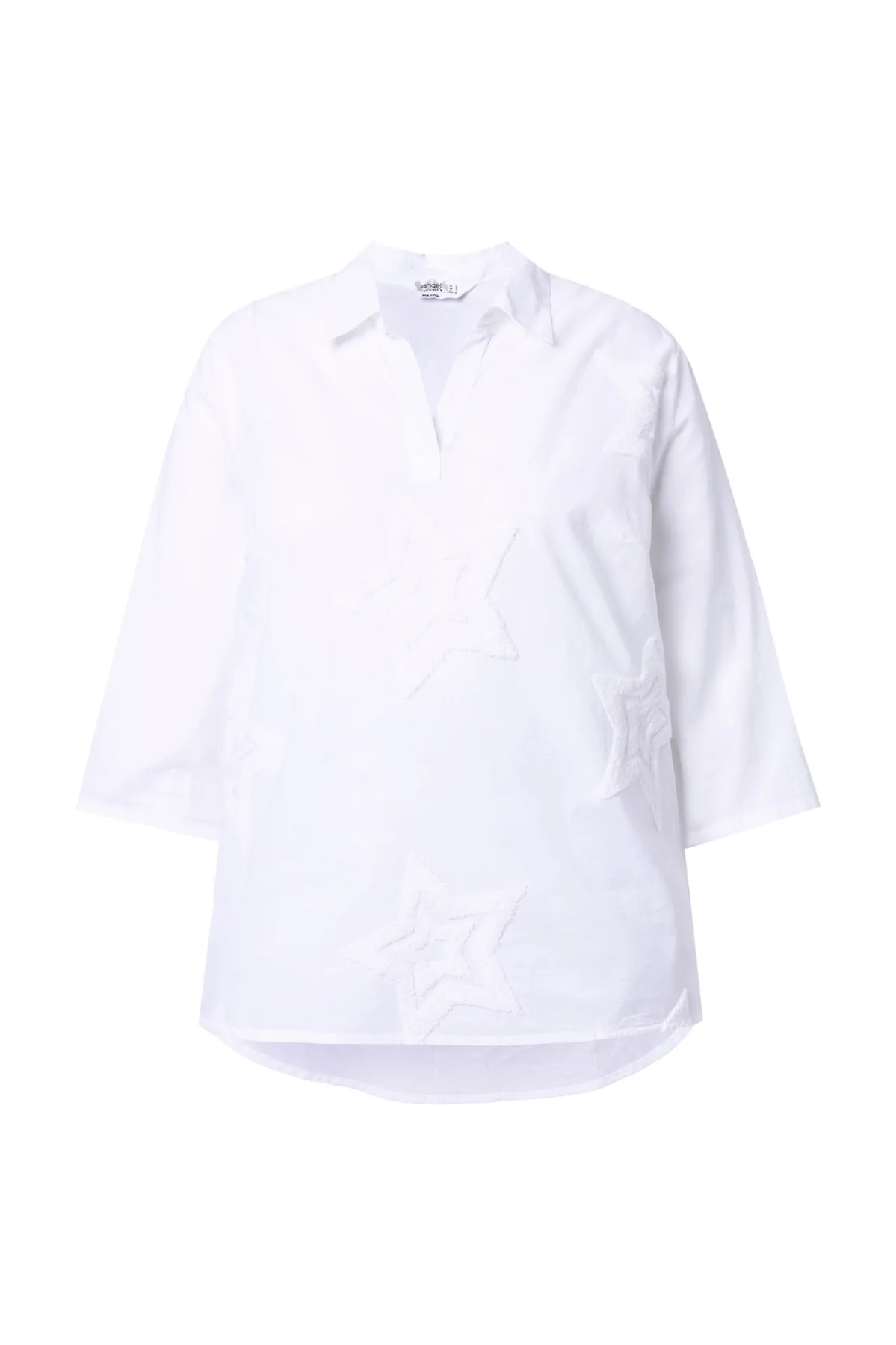 Blouse type: Blouseshirt; Design: A-lijn, Verlengd rugpand; Materiaal: Katoen; Kraag: Opstaande kraag; Extra's: Op staal naden; Pasvorm: Normale pasvorm; Armlengte: Driekwart mouw; Lengte: Normale lengte