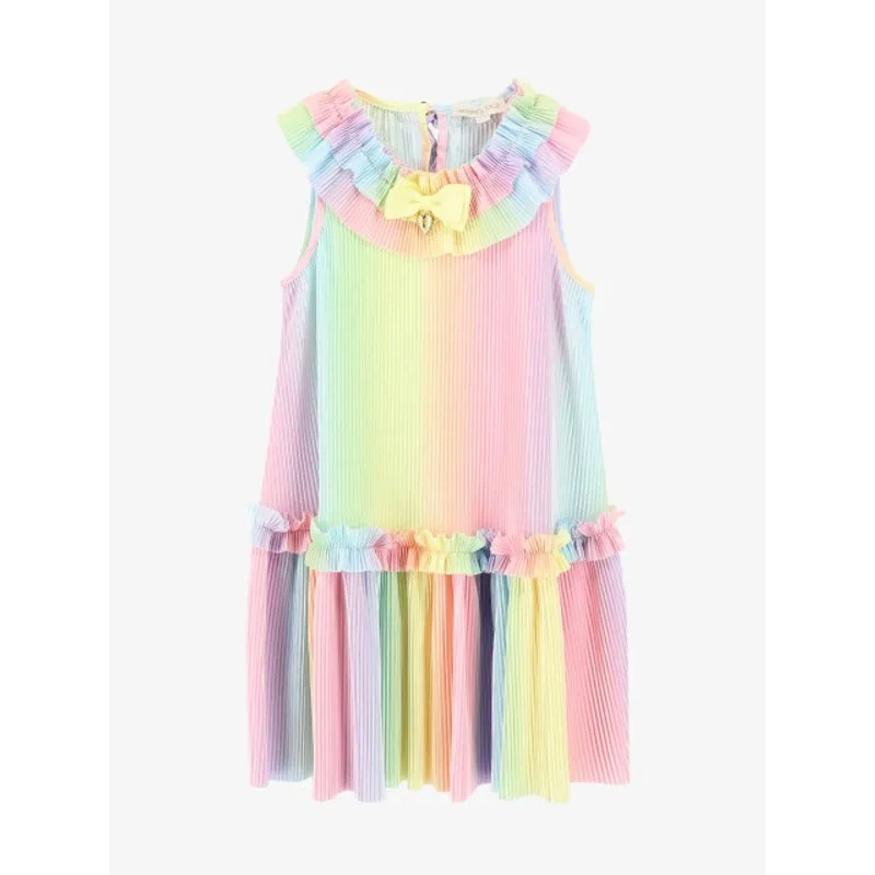 De Angels Face Ember Jurk in de kleur Rainbow heeft plooien, roezels en een gele strik De jurk heeft vrolijke regenboog kleuren: roze, blauw, paars, geel, oranje en groen.