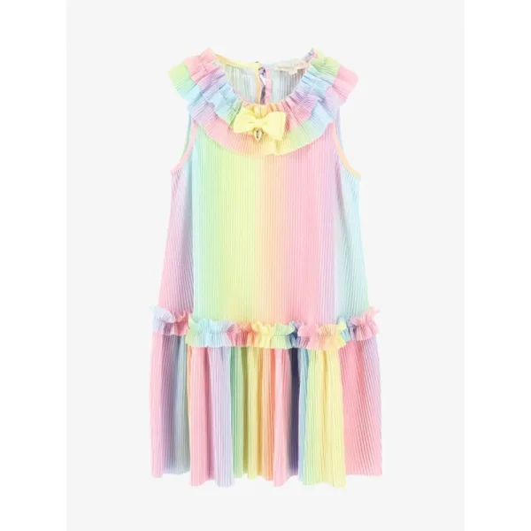 De Angels Face Ember Jurk in de kleur Rainbow heeft plooien, roezels en een gele strik De jurk heeft vrolijke regenboog kleuren: roze, blauw, paars, geel, oranje en groen.