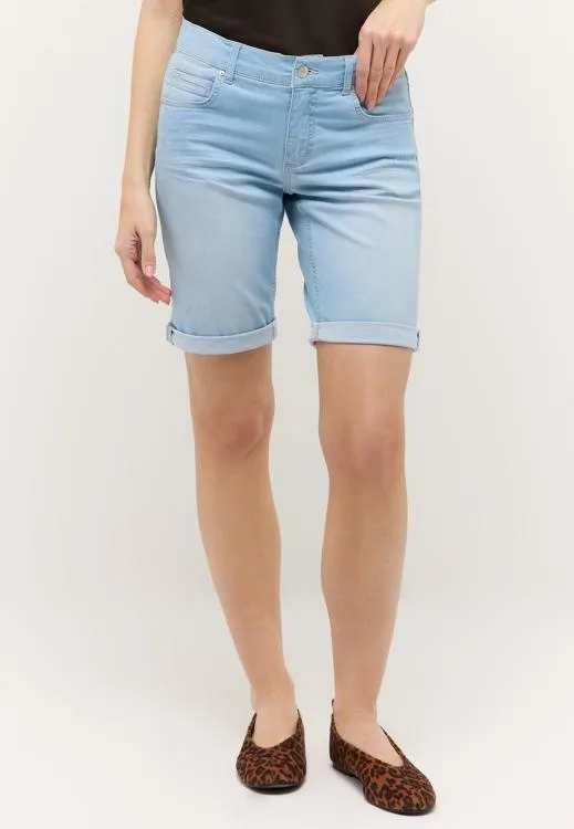 Deze Angels jeans is gemaakt van stevige denim in een lichtblauwe wassing. Het model heeft een ritssluiting met metalen knoop, 5-pocket indeling en riemlussen. De pijpen vallen tot boven de knie met een nette omgeslagen zoom. Subtiele vervaging geeft een elegante, zomerse look. Het Angels logo is zichtbaar op de binnenband. Een geliefde keuze binnen de Angels-collectie; wees er snel bij, want populaire jeans gaan vaak hard.