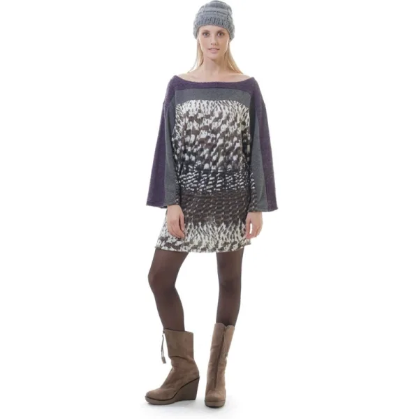Dierenpatronen en effen gekleurde panelen creëren een betoverende visuele uitstraling voor deze mini sack-jurk van 2-Young. Het lichte gebreide lijfje wordt gecontrasteerd door gezellige gebreide stoffen op de schouders en armen, wat zorgt voor textuur. Brede off-shoulder halslijn. Lange wijde mouwen.