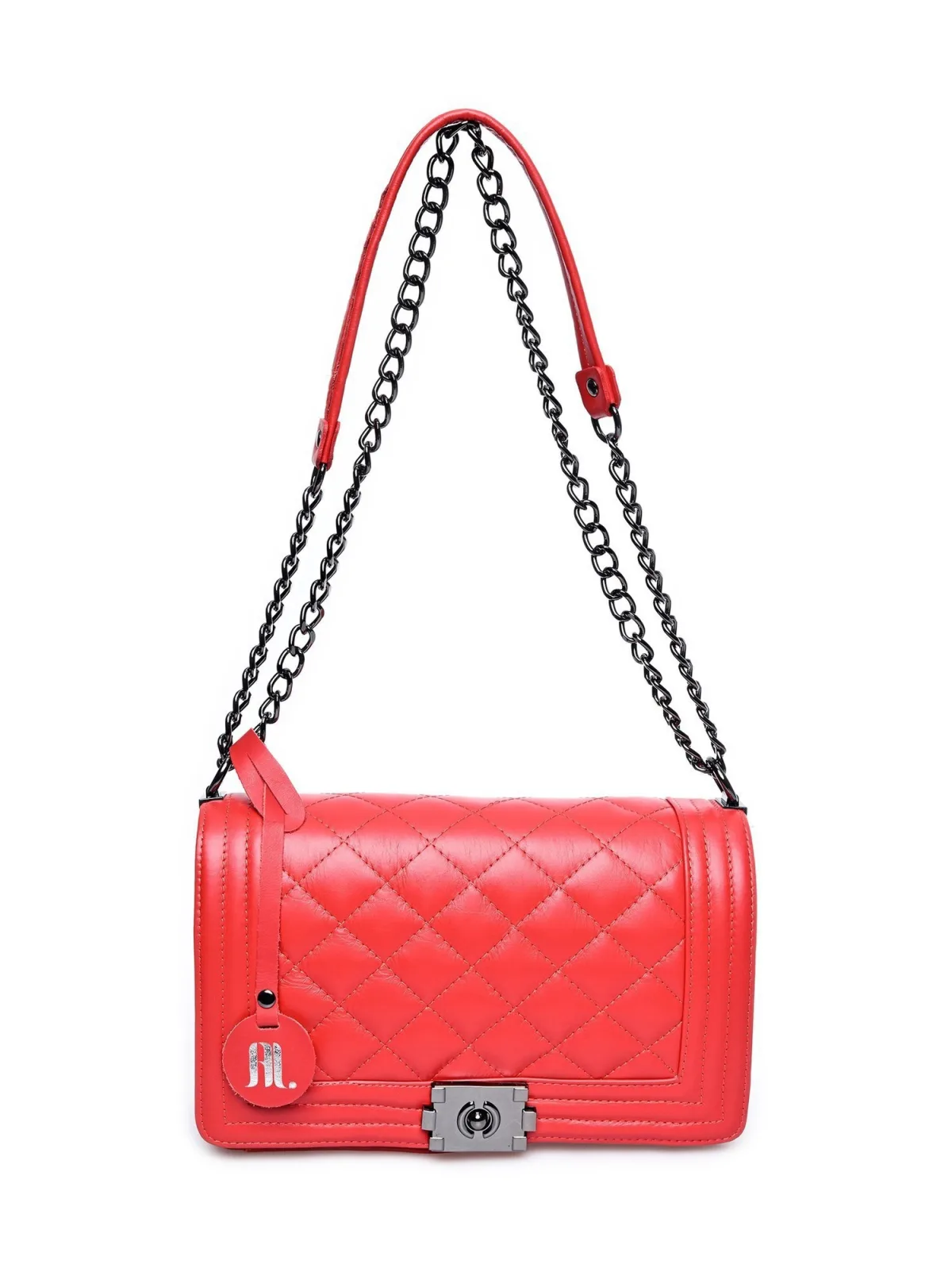 Schoudertas 100% koeienleer Flapper over met metalen beslag Binnenste organiserende ritszak Binnenste ritszak Binnenste leren telefoonzak Schouderkettingriem: 110 cm Afmetingen (M): 18x26,5x8,5 cm