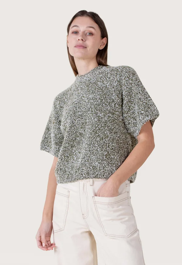 Dit is de T04-226150 Alys Knitted Trui van het merk Another-Label. Deze trui heeft een loose pasvorm en is gemaakt van een samenstelling van gerecycled polyester, acryl, spandex en wol. Met een ronde hals en korte, wijde mouwen biedt deze trui een ontspannen en stijlvolle look. De dropped shoulders voegen een extra dimensie toe aan het ontwerp, wat zorgt voor een moeiteloos silhouet.