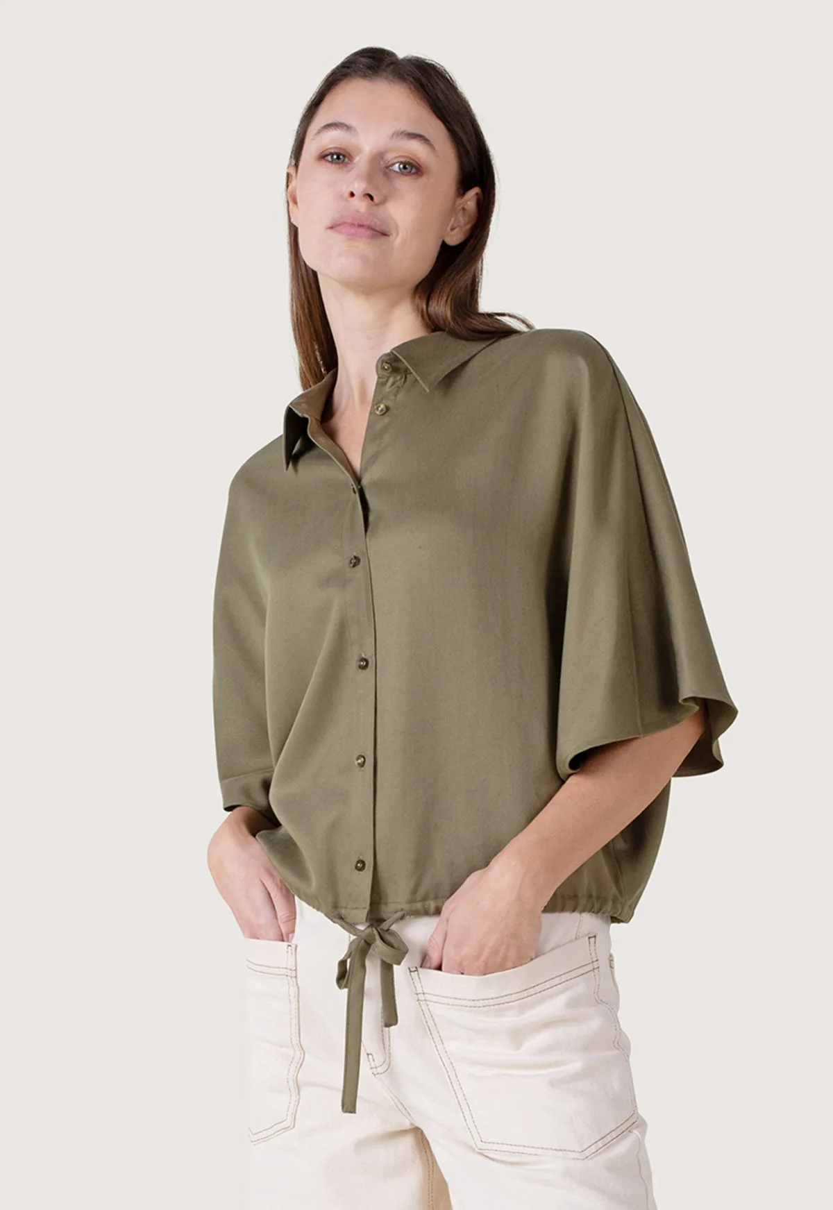 Dit is de H42-226108 Rila Blouse van het merk Another-Label. Deze blouse heeft een loose pasvorm en is vervaardigd uit hoogwaardig Tencel, een ademend en milieuvriendelijk materiaal dat zacht rond het lichaam valt. De Rila Blouse kenmerkt zich door de zachte driekwart dolmanmouwen en heeft een knoopsluiting met MOP knopen die zorgen voor een verfijnde afwerking.