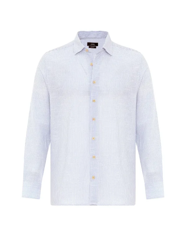 Design: Recht model, Knop placket, Geribd ceintuurtje, Nektape; Type sluiting: Knoopsluiting; Materiaal: Katoen; Motief: Gestreept; Kraag: Kentkraag; Extra's: Lichte stof, Voelt zacht aan; Pasvorm: Regular fit; Armlengte: Lange mouw
