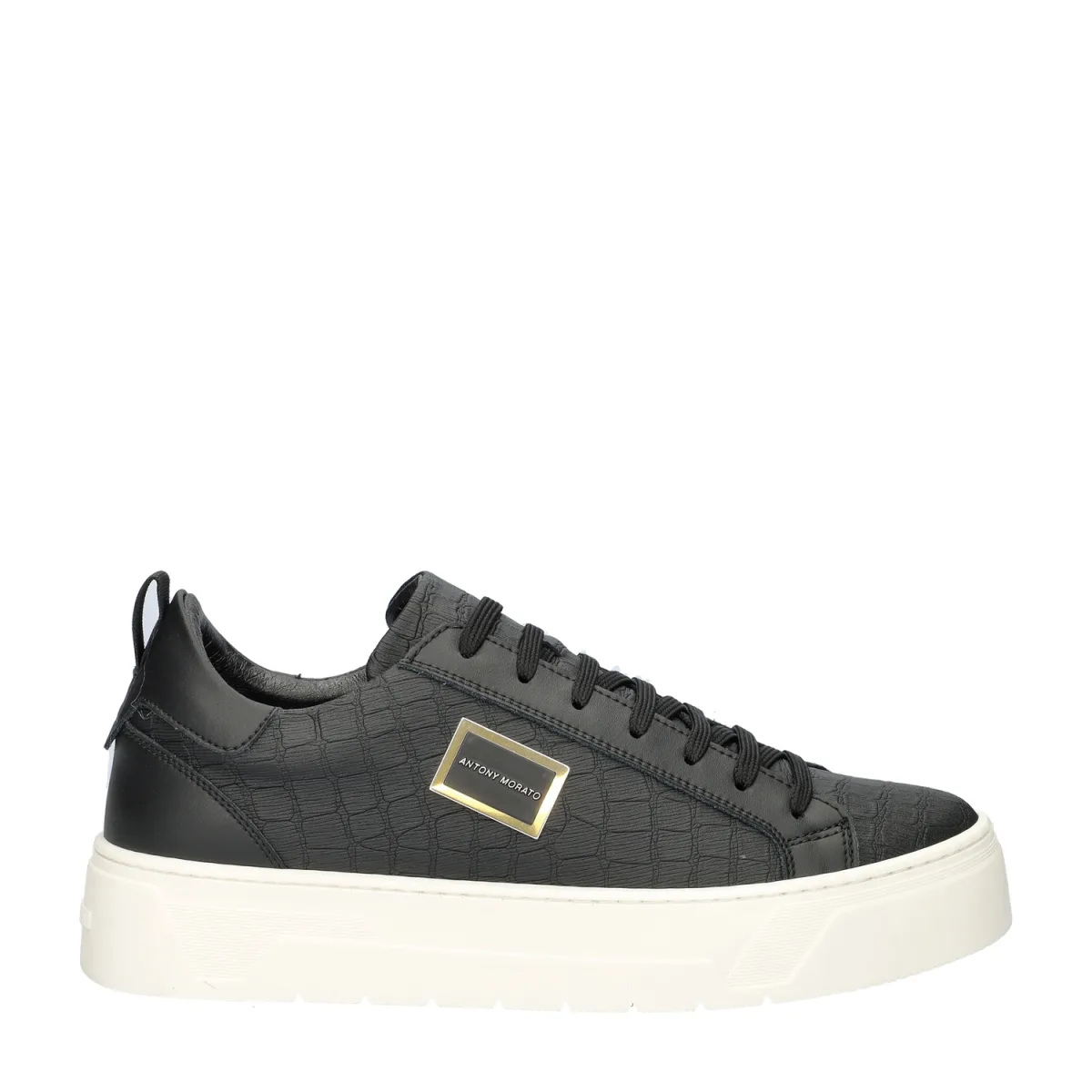 Antony Morato Metal Bold heren sneaker Deze stijlvolle sneakers van Antony Morato passen mooi onder een casual outfit, maar ook onder een semi-formele look. Uitgevoerd in leer met trendy croco-partoon en voorzien van metalen logo-plaatje op de zijkant. Gevoerd met imitatieleer en badstof. Het badstof zorgt voor een aangenaam draaggevoel en goede vochtabsorptie. Dankzij de gewatteerde enkelkraag ervaar je optimaal comfort. Voorzien van een textielen voetbed met foamonderlaag wat voor een fijne demping zorgt tijdens het lopen. Afgewerkt met een stijlvolle elevated loopzool met voldoende grip.