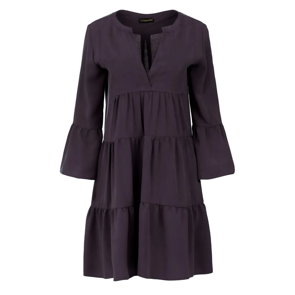 Jurk met geplooide naden van geweven stof. Driekwart klokmouwen. Ronde hals met een V-opening van 24 cm aan de voorzijde. Drukknoop aan de binnenkant onderaan de V om te voorkomen dat deze te veel opent. Langwerpige dubbele stof onder de V-opening aan de voorkant. De jurk heeft twee 24 cm brede, geplooide panelen. Dubbele plooi aan de achterkant. Losvallend A-lijnmodel. Valt boven de knie.