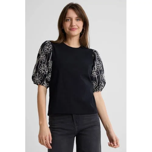 Deze top voor dames van Anytime is gemaakt van een jersey-/woven mix. Het model heeft een ronde hals en korte pofmouwen. De mouwen zijn van een geweven stof met bloemenborduursel, wat het een speelse touch geeft. Een stijlvolle top die je makkelijk combineert voor elke gelegenheid.Details van deze top:• ronde hals• jersey stof• pofmouwen• elastische boorden bij mouweinde• woven stof met bloemenborduursel