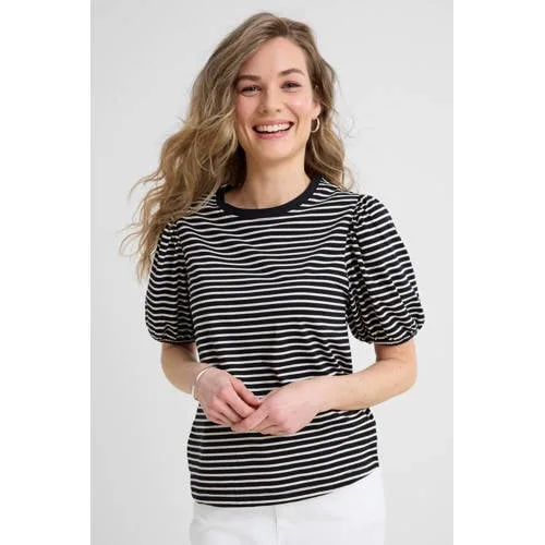 Anytime T-shirt met pofmouwen gestreept zwart/beige Prijzen