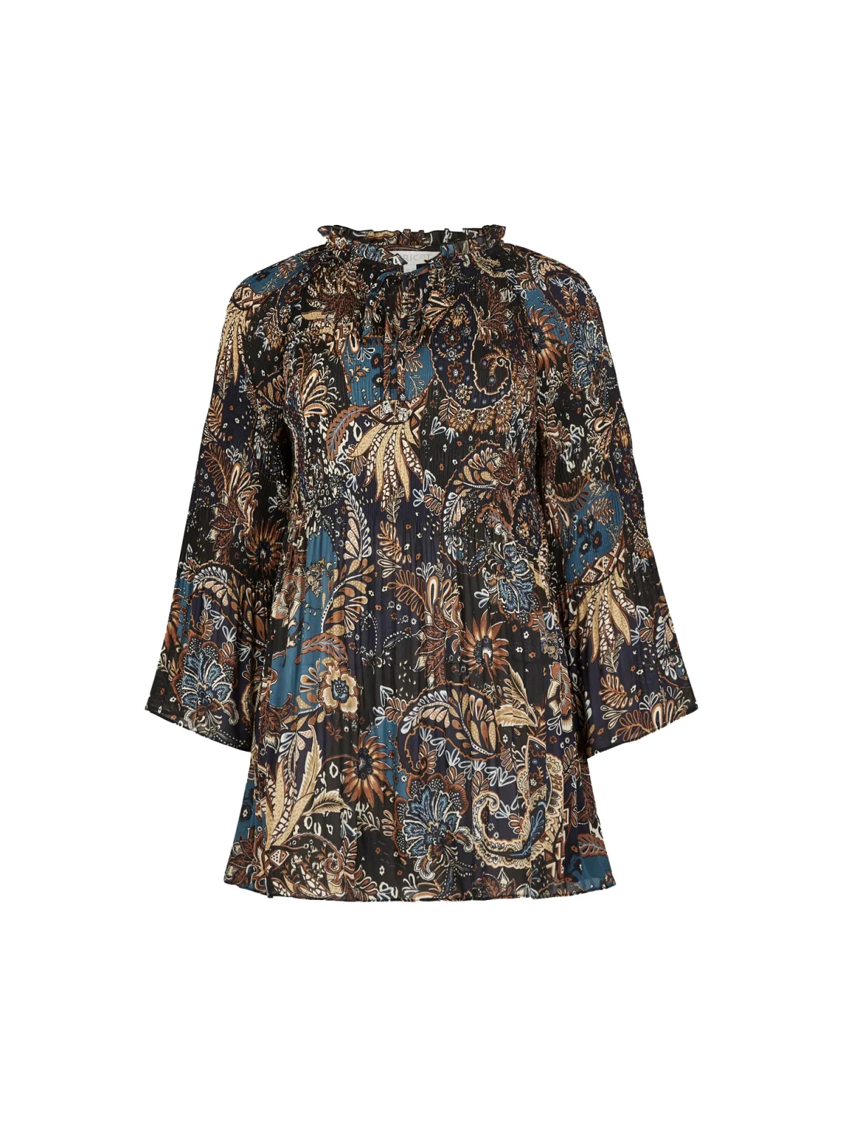 Blouse type: Wijde blouse; Design: Gevoerde zoom/rand; Motief: Paisley; Kraag: Tuniek kraag; Details: Ruches, Plissé; Extra's: Gladde stof; Pasvorm: Normale pasvorm; Armlengte: Driekwart mouw; Lengte: Normale lengte