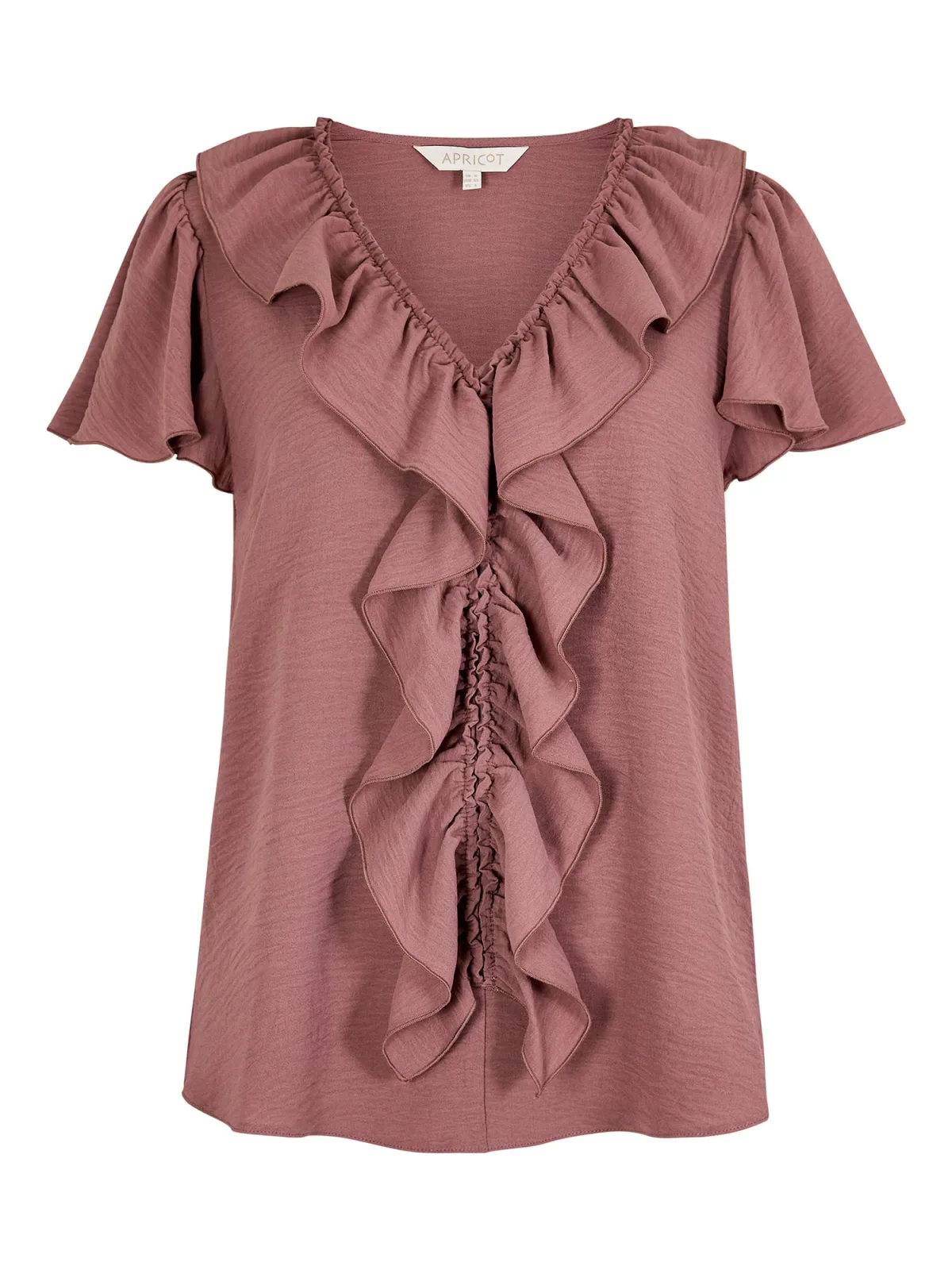 Blouse type: Blouseshirt; Design: Trompetmouwen; Type sluiting: Slip; Motief: Effen; Details: Ruches; Extra's: Op staal naden; Pasvorm: Losse pasvorm; Armlengte: Halve mouw; Lengte: Normale lengte
