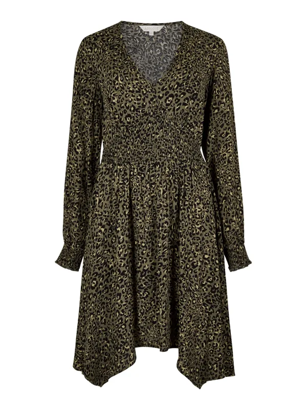 Design: Elastische taille/zoom, Pofmouwen; Materiaal: Gerecycled materiaal; Halstype: V-hals; Motief: Dierenprint; Details: Gedrapeerd; Extra's: Label patch/label flag, Op staal naden; Lengte: Knielengte; Snit: Getailleerd; Pasvorm: Normale pasvorm; Armlengte: Lange mouw