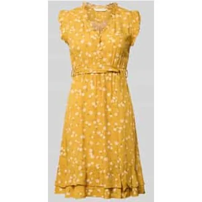 dames mini-jurk van Apricot;Zuivere viscose;getailleerd model;V-hals met ruches;Korte knoopsluiting;kapmouwen;strikceintuur;Laagjesrok;ruglengte bij maat S: 89 cm;borstwijdte bij maat S: 38 cm