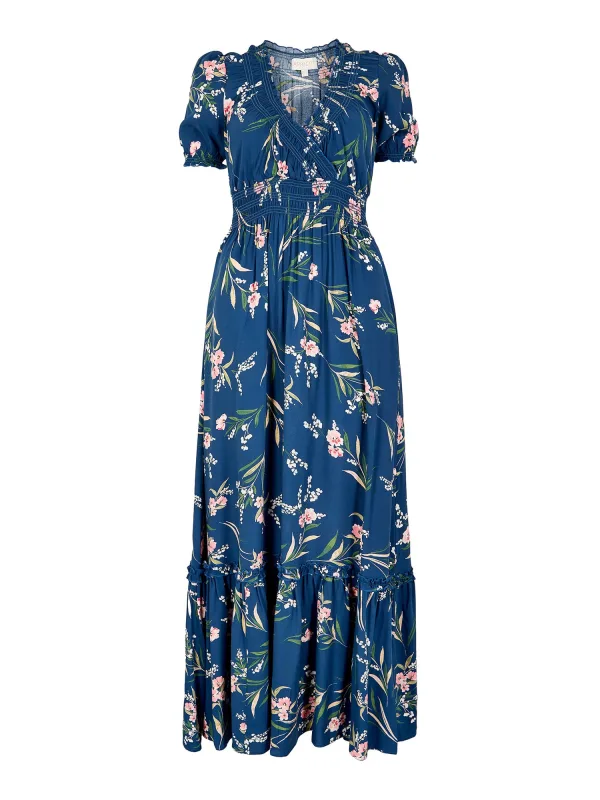 Design: Mouw revers; Materiaal: Viscose; Halstype: V-hals; Motief: Bloemenprint; Details: Ruches, Volant, Plooien, Gedrapeerd; Extra's: lange lengte; Lengte: 7/8 lengte; Snit: Getailleerd; Pasvorm: Normale pasvorm; Armlengte: Kwartmouw