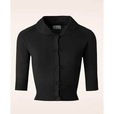 Deze schattige 40s April Bow Cardigan in Black heeft ons weten te strikken! Classy en schattig met haar elegante halve mouwtjes, speelse Peter Pan kraagje en lieflijke strikjes. Uitgevoerd in een zachte, stretchy, fijngebreide zwarte viscosemix waardoor ze heerlijk draagt. De combinatiemogelijkheden zijn eindeloos! * Korter model * Rij verborgen drukknoopjes * Stretchy ribboord langs de mouwtjes en onderkant