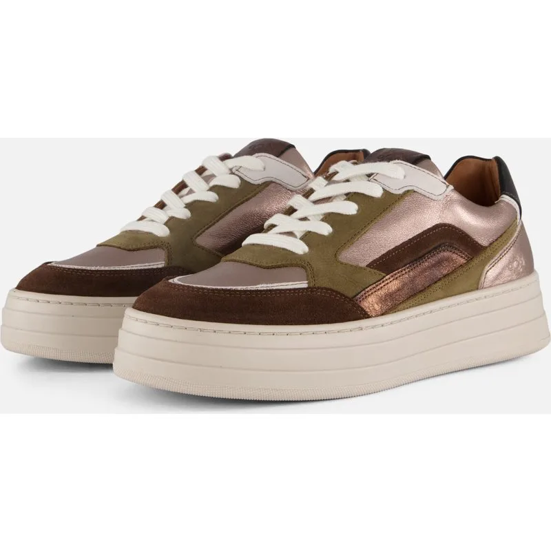 De AQA sneakers voor dames zijn uitgevoerd in glanzend bronskleurig leer en hebben zowel een leren bovenkant als binnenvoering. Dit zorgt voor een luxe uitstraling en hoog draagcomfort. Met hun moderne design zijn deze sneakers eenvoudig te combineren en ideaal voor dagelijks gebruik.