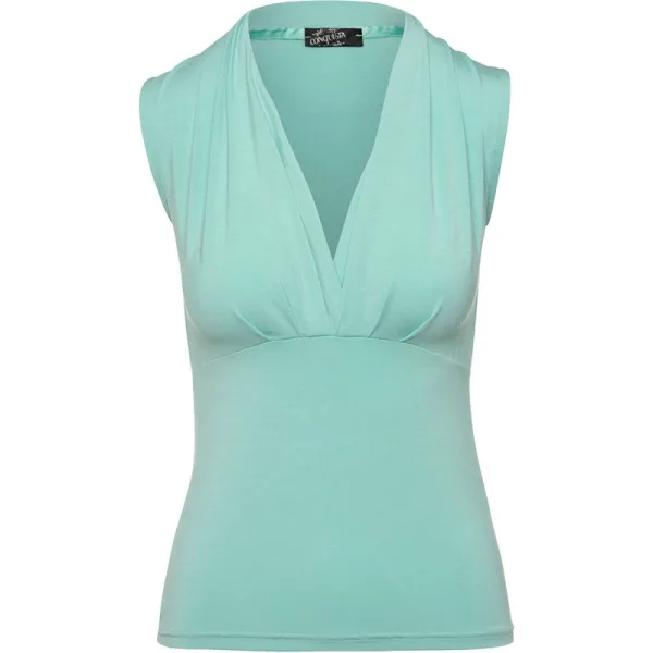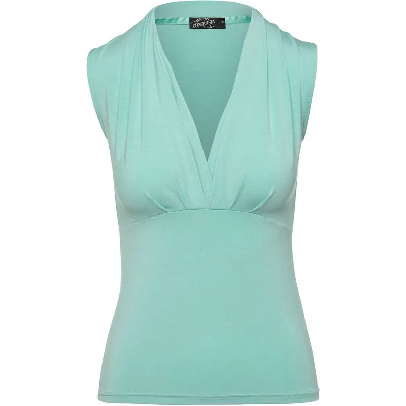CONQUISTA top van stretchstof: viscose-elastaan. Mouwloos met een imitatiewikkeleffect aan de voorkant voor een diepe V-hals. Naad onder de buste.