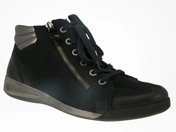 Halhoge veterschoen met uitneembaar voetbed. De schoen is gemaakt van nubuck en heeft een voering van textiel. De schoen heeft naast een vetersluiting ook een ritssluiting, die een speelse look geeft aan de schoen.