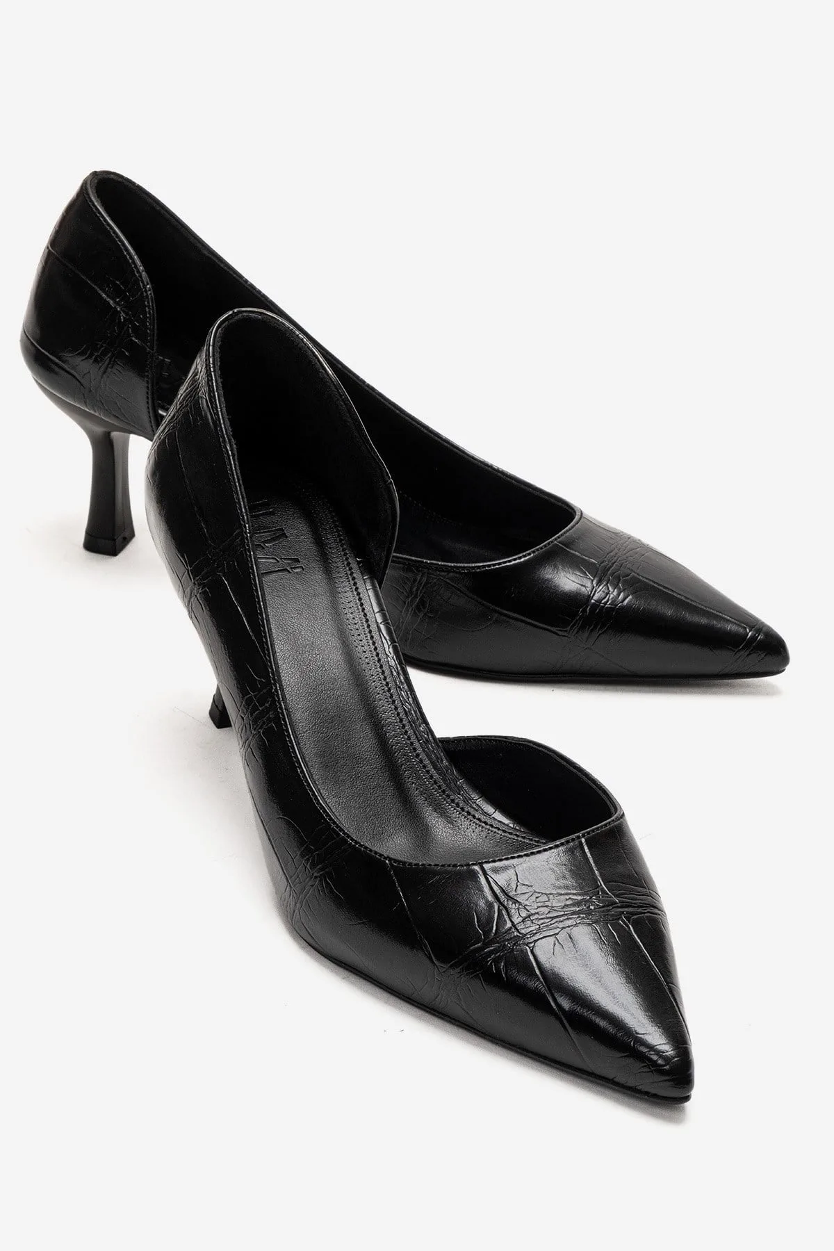 Een gebeeldhouwde stiletto die klassieke lijnen herinterpreteert met een glanzende krokodillenprint