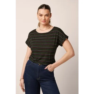 “Stripe up your everyday look.” Met dit te gekke T-shirt ben je altijd in stijl! Ze is uitgevoerd in een luchtige zwarte EcoVero viscosemix met gekleurde streepjes en draagt heerlijk comfortabel. * Ronde halslijn * Korte mouwen met vaste omslagjes * Lang genoeg om op een normale heupbroek te dragen