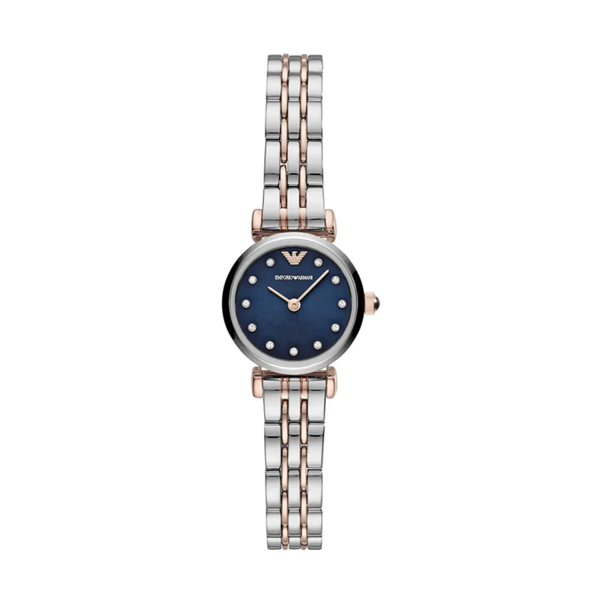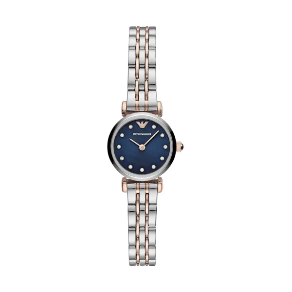 Emporio Armani AR11222 is een klein maar prachtig dameshorloge. Met een tweekleurige (roségoud/zilver) roestvrijstalen armband, een opvallende koningsblauwe sunray-wijzerplaat en kristallen als indexen. Dit horloge straalt verfijning uit door eenvoud en is verfijnd voor zowel feestelijke gelegenheden als dagelijks gebruik. 22 mm breedte