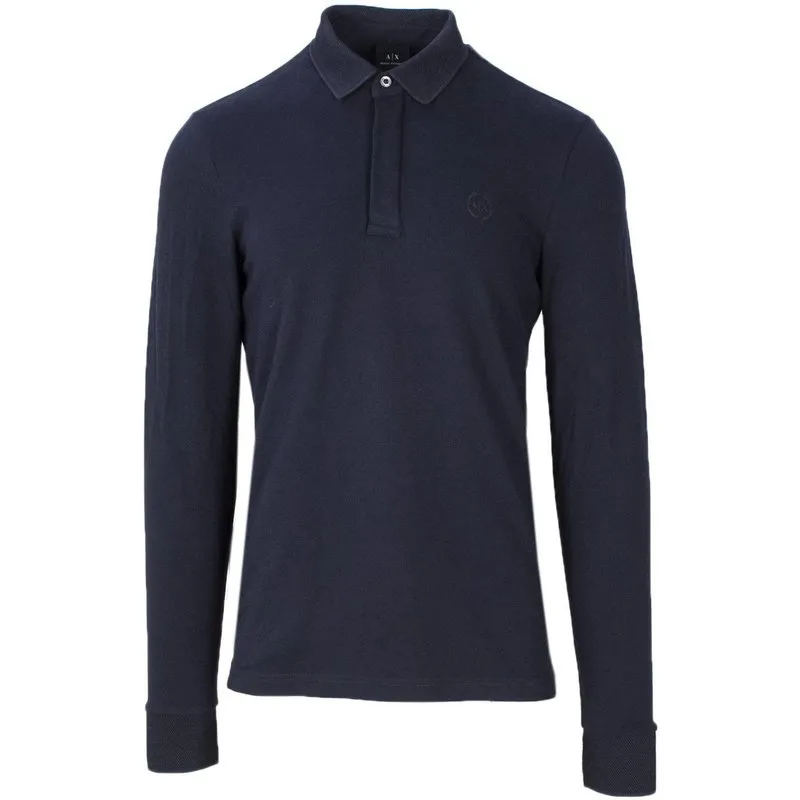 Tijdloze effen lange mouwen polo shirt Merk: Armani Exchange Geslacht: Heren Type: Polo Seizoen: Herfst/Winter Kleur: Blauw Patroon: Effen Sluiting: Knopen Mouwen: Lang Kraag: Polo Samenstelling: 96% katoen 4% elastaan 96% katoen 4% elastaan Machinewasbaar op 30 graden Maat op het label: 2XL