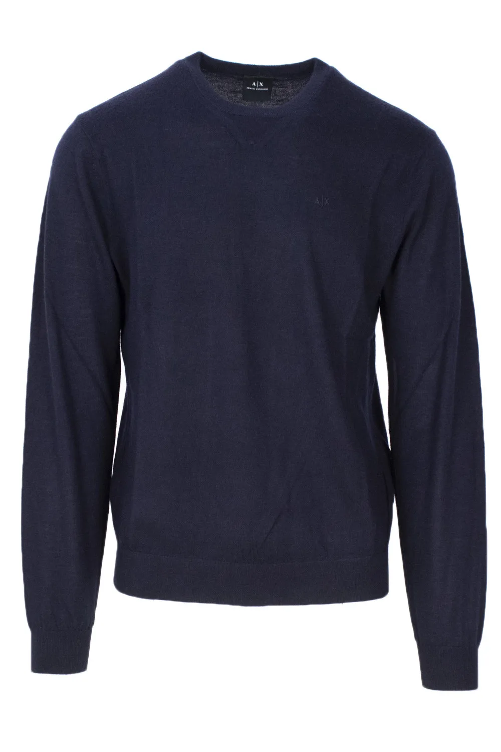 Merk: Armani Exchange Geslacht: Heren Type: Breiwerk Seizoen: Herfst/Winter PRODUCTDETAIL; Kleur: blauw; Patroon: effen; Sluiting: instap; Mouwen: lang; Halslijn: ronde hals SAMENSTELLING EN MATERIAAL; Samenstelling: -100% wol Wassen: handwas. print: effen. materiaal: katoen. type: bomber
