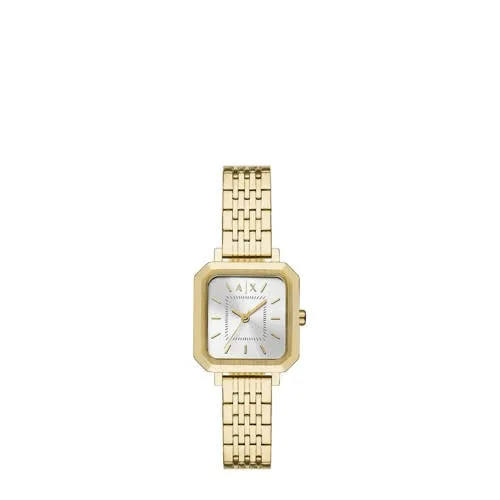Dit Armani Exchange horloge van 27 mm heeft een zilverkleurige sunray-wijzerplaat, een uurwerk met drie wijzers en een goudkleurige roestvrijstalen armband.