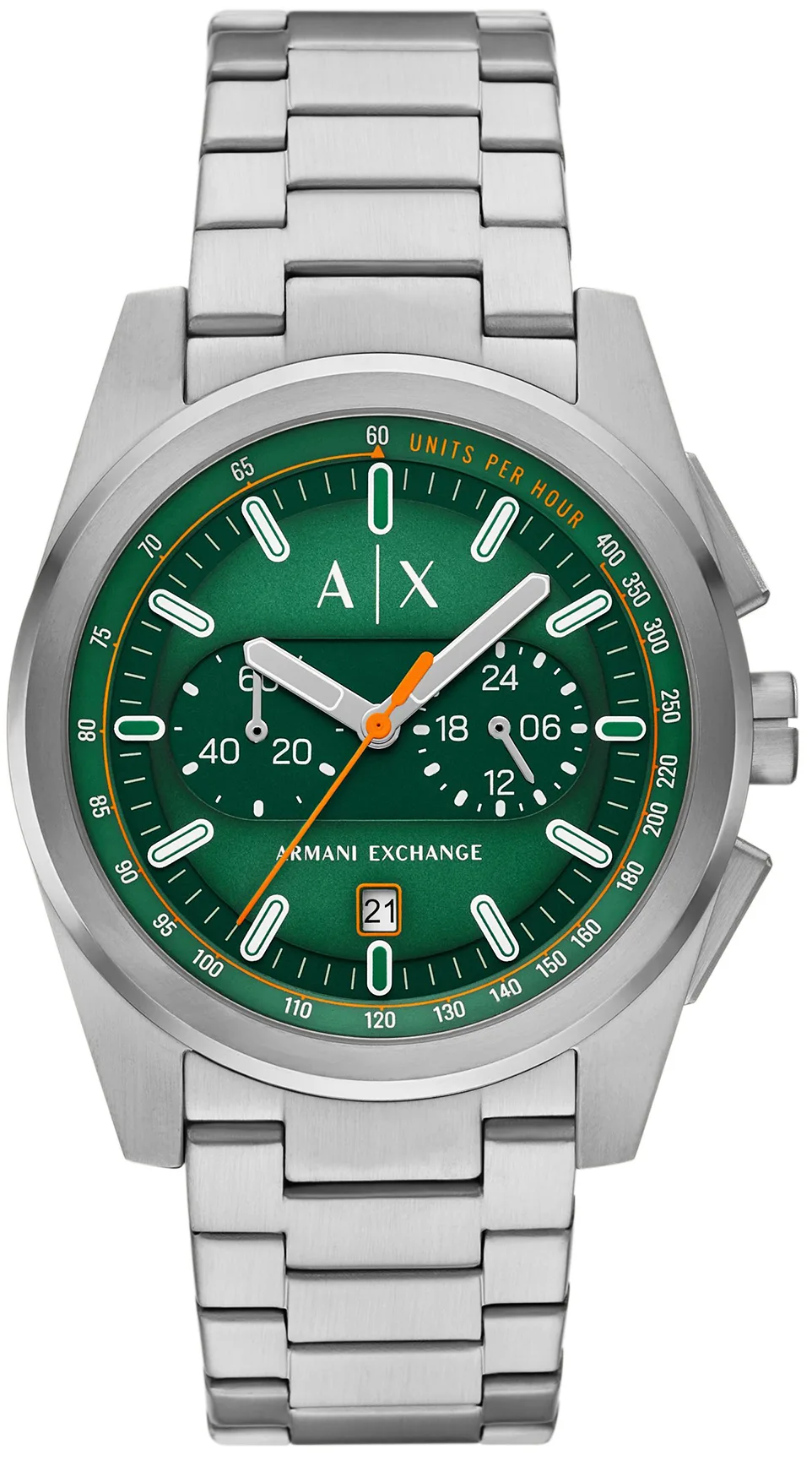 Deze Armani Exchange Parker Chronograaf Horloge voor Mannen is het perfecte tijdstuk om te dragen of cadeau te geven. De zilveren ronde kast van 44 mm, gecombineerd met de comfortabele zilveren roestvrijstalen horlogeband, zorgt ervoor dat je optimaal van dit prachtige horloge kunt genieten zonder enige concessies. Aangedreven door een hoogwaardige quartz beweging en waterdicht tot 5 bar, blijft je horloge tikken. Dit sportieve en klassieke horloge is perfect voor elke gelegenheid! Dit chronograaf horloge heeft een kalendervunctie: datum, evenals een stopwatch, 24-uursweergave en tachymeter. Hoogwaardige 21 cm lange en 21 mm brede zilveren roestvrijstalen band met een vouwsluiting met drukknop. Kastdiameter: 44 mm, kastdikte: 11 mm, kastkleur: zilver en wijzerplaatkleur: groen.