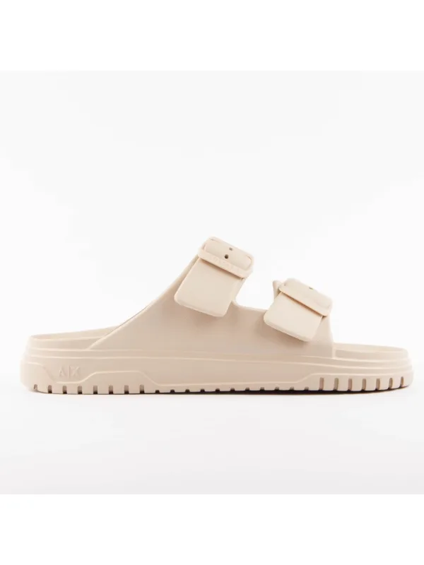 Armani Exchange Soul herenclaquette van synthetisch materiaal in beige. Authentieke schoen van het merk Armani Exchange - streetwear/sportswear design van Armani Exchange - Armani Exchange voor heren, ideaal voor dagelijks gebruik - De beige Armani Exchange claquette past perfect bij de rest van je garderobe - Comfortabele synthetische materialen - Klassieke gesp - Soul - Synthetisch