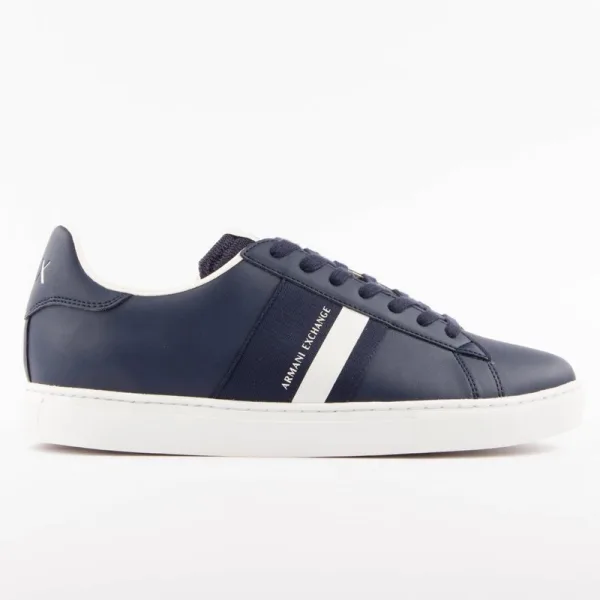 Armani Exchange Taco herensneakers van blauw leer. Authentieke Armani Exchange merkschoen - streetwear/sportswear design van Armani Exchange - Armani Exchange voor heren, modieus, perfect voor dagelijks gebruik - deze blauwe Armani Exchange sneakers passen perfect bij de rest van je garderobe - comfortabel leren materiaal - klassieke veters - Taco design - synthetisch
