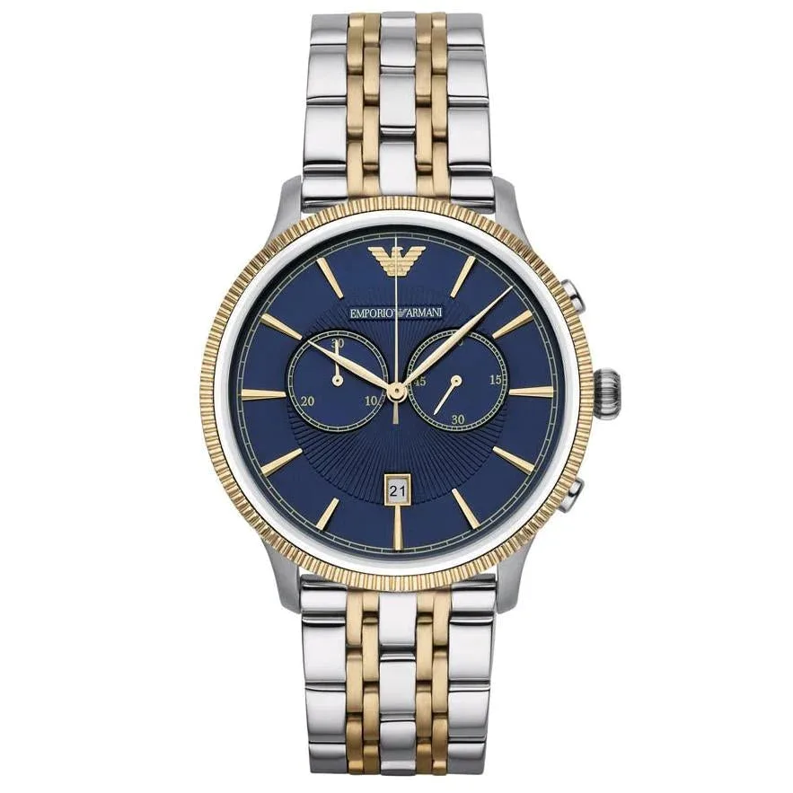 Het blauwe en tweekleurige roestvrijstalen herenhorloge Emporio Armani AR1847 is een sensationeel herenhorloge. Dit horloge heeft een kast van gehard staal van 43 mm met een chronograafweergave. Het horloge heeft een donkere wijzerplaat met een band van gehard staal en wordt geactiveerd door quartzverbetering. Het horloge is waterdicht tot 30 meter en wordt geleverd met een showdoos.