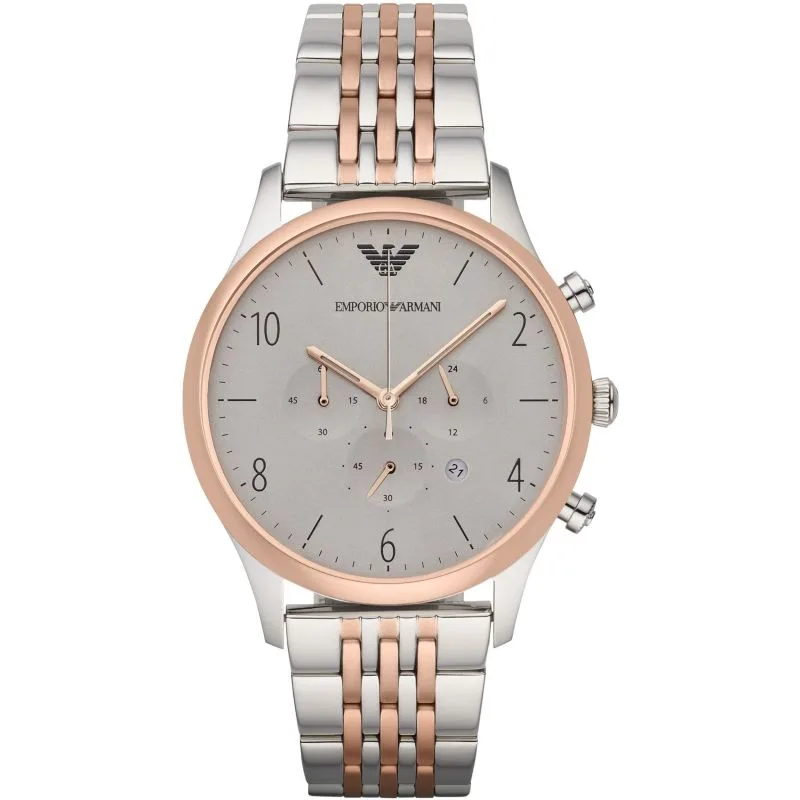 Vertel de tijd op een gemakkelijke en representatieve manier met dit horloge van Emporio Armani dat een slanke en verfijnde uitstraling heeft. Met een gepolijste roestvrijstalen kast en armband in tweekleurig roségoud en zilver, met een klassieke grijze wijzerplaat. Afgewerkt met een vlindergesp en drukknoppen. 43 mm breed