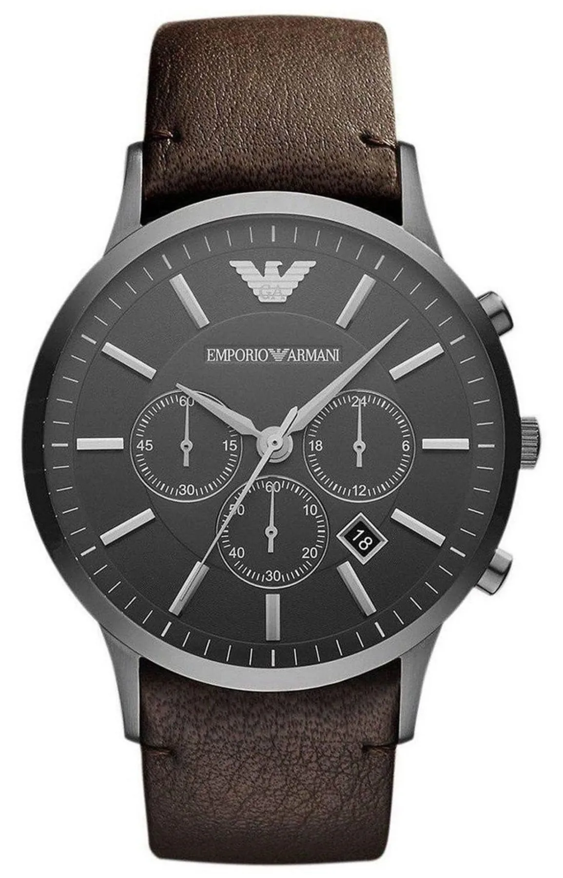 Dit Emporio Armani AR2462-horloge heeft een gunmetal wijzerplaat op een vergulde roestvrijstalen kast. Een bruine leren band en bruine wijzerplaat maken de look compleet. 46 mm breed