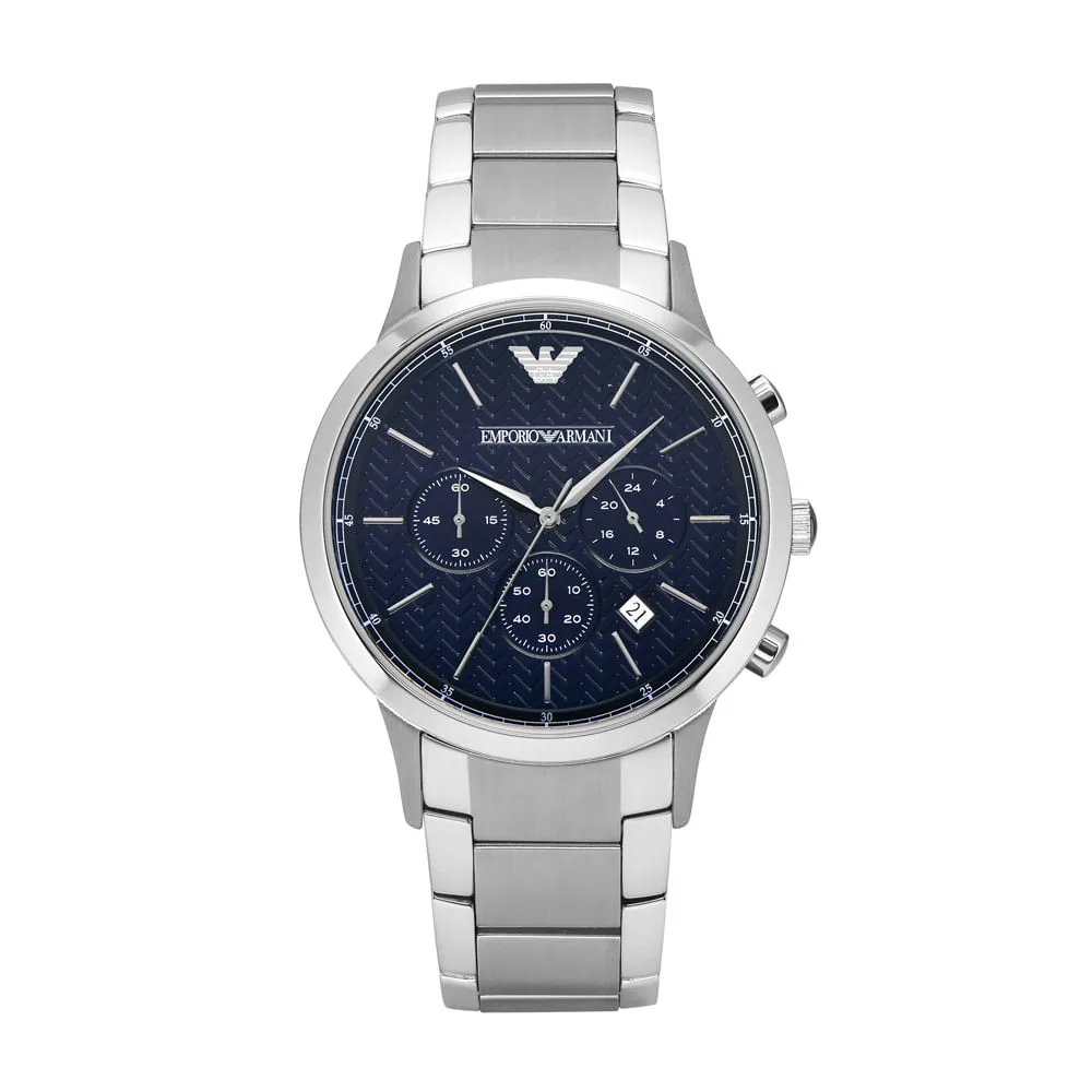 Emporio Armani AR2486 herenhorloge heeft een roestvrijstalen kast en is voorzien van een chronograaf quartz uurwerk. Het heeft een zilveren metalen armband en een donkerblauwe wijzerplaat. Het horloge beschikt over een datumfunctie. 43 mm breed