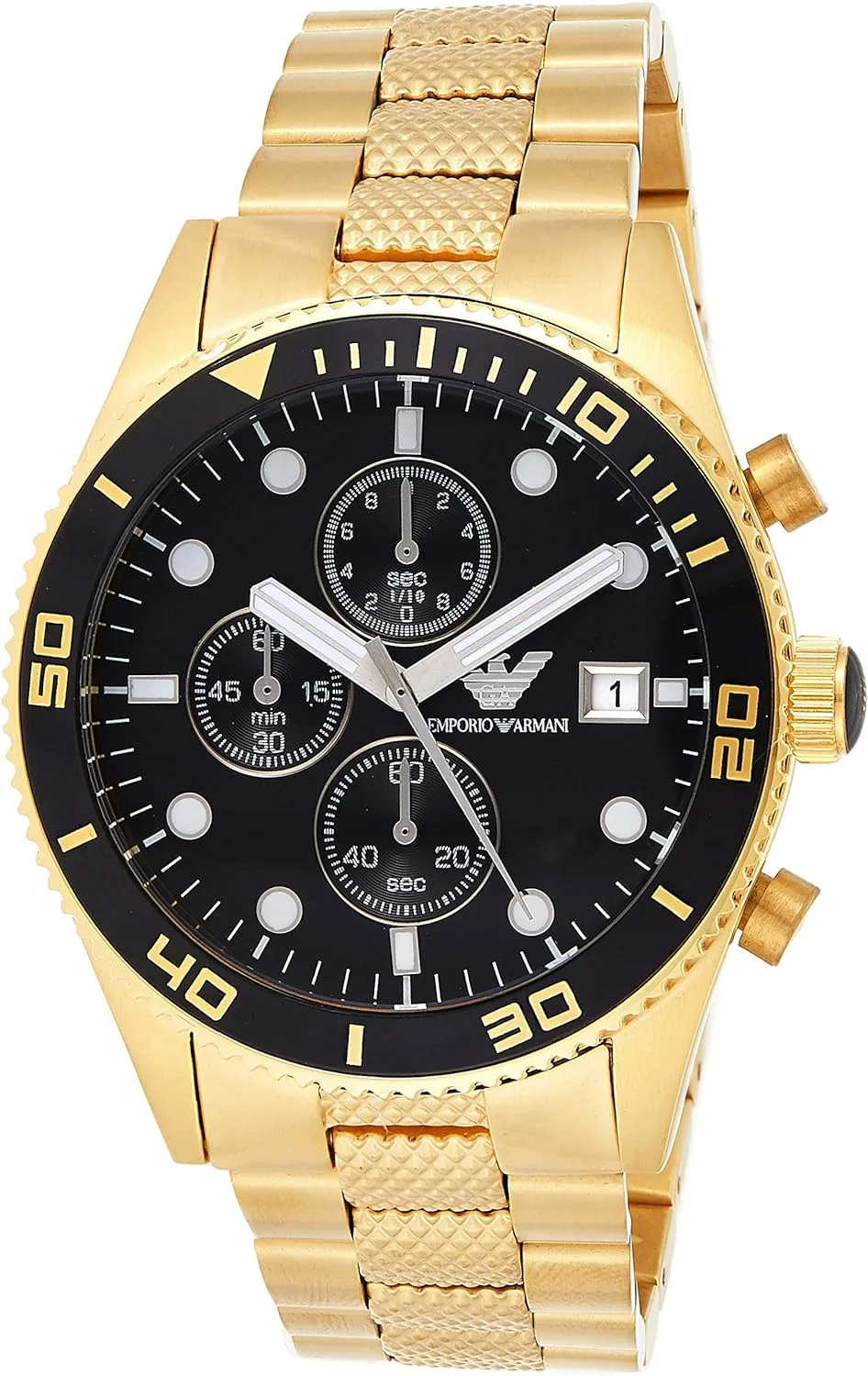 De Emporio Armani AR5857 is het ideale herenhorloge dat geschikt is voor formeel of normaal gebruik. Het horloge is voorzien van quartz-vooruitgang, chronograafweergave, datumaanduiding, waterafschrikmiddel tot 50 meter, prachtige gouden metalen band met goud voltooide het proces van het organiseren rond de stropdas. Het heren PVD gouden roestvrijstalen chronograaf Emporio Armani horloge AR5857 is met een briljante zorgvuldigheid uitgevoerd. De heren PVD gouden roestvrijstalen chronograaf Emporio Armani horloge AR5857 zou een ideaal cadeau zijn voor elke Emporio Armani horloge-lieveling. 43 mm breed
