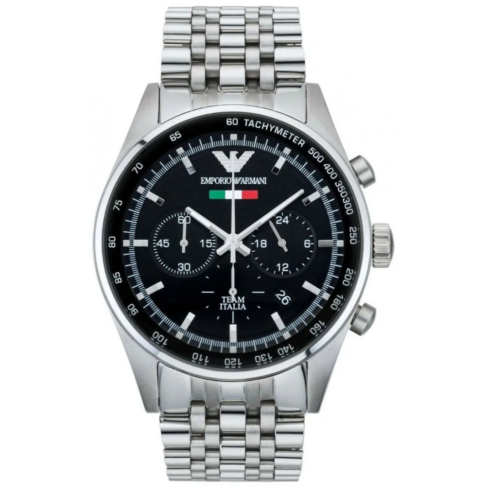 Emporio Armani Team Italia herenhorloge afgewerkt in zilver roestvrij staal met vlindersluiting met drukknop. Zwarte wijzerplaat met zilverkleurige lichtgevende wijzers en uurmarkeringen. Nauwkeurig Japans quartz-mechanisme met datum- en chronograaffuncties. 43 mm kastbreedte