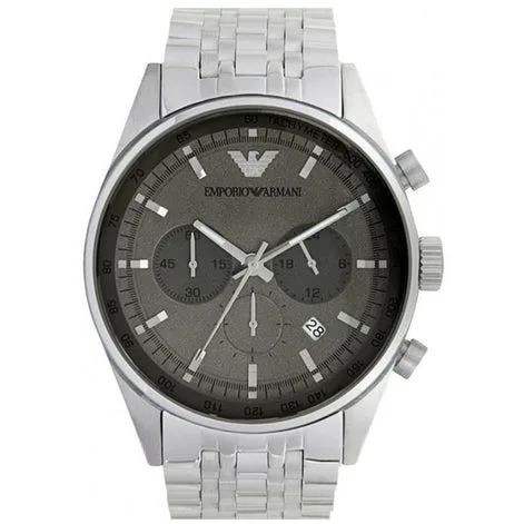 Stijl en eenvoud zijn kenmerken van dit fijne uurwerk van Emporio Armani. Dit herenhorloge heeft een gladde en grijze wijzerplaat van klassiek roestvrij staal met een sluiting die perfect om je pols past. De slanke en stijlvolle roestvrijstalen kast geeft hem een unieke vonk en zilveren wijzers. Het heeft een roestvrijstalen kast van 43 mm en een roestvrijstalen band van 20 mm.